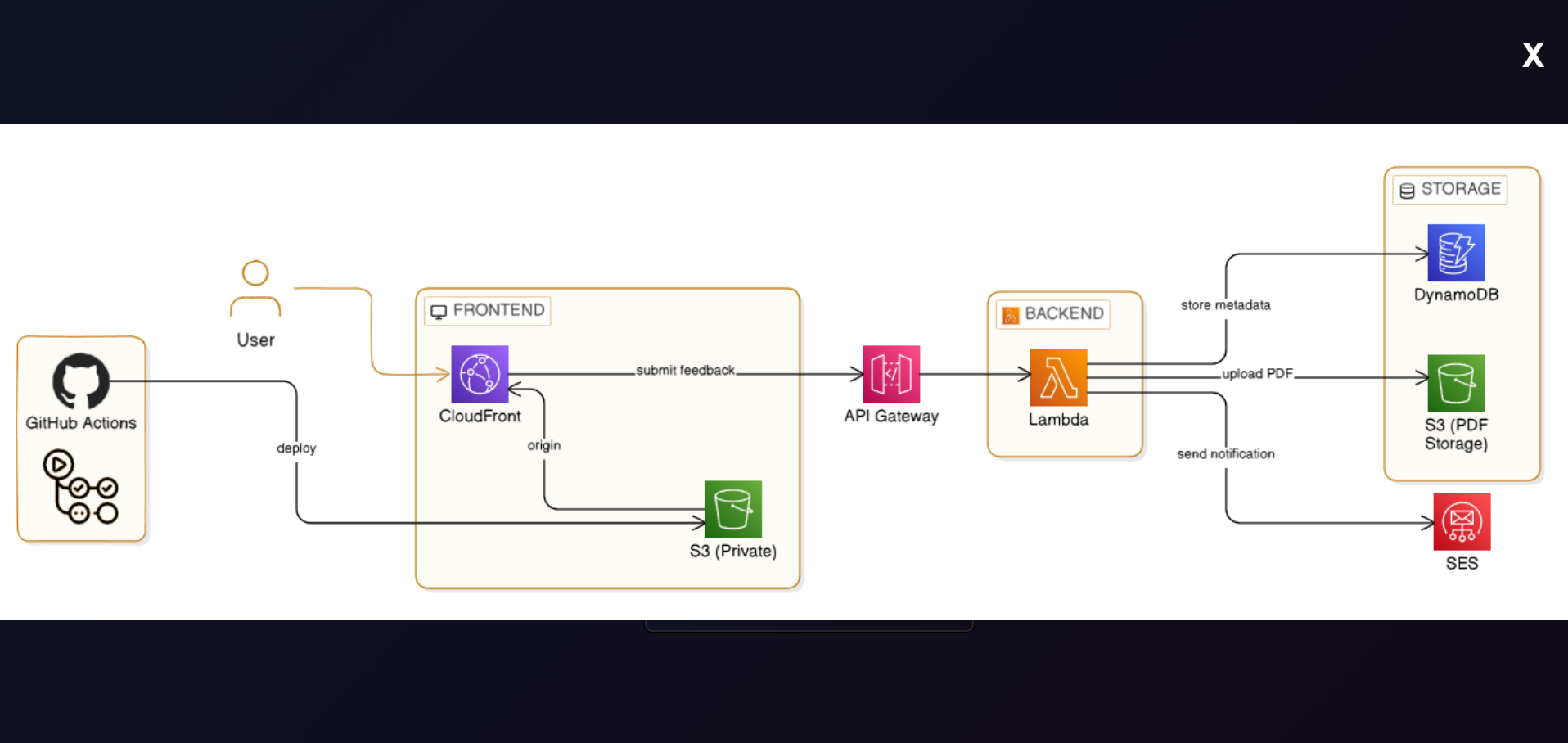 A cloud architecture app for serverless scalable feedback management. By integrating multiple AWS core services: S3, CloudFront, API Gateway, Lambda, DynamoDB and SES.