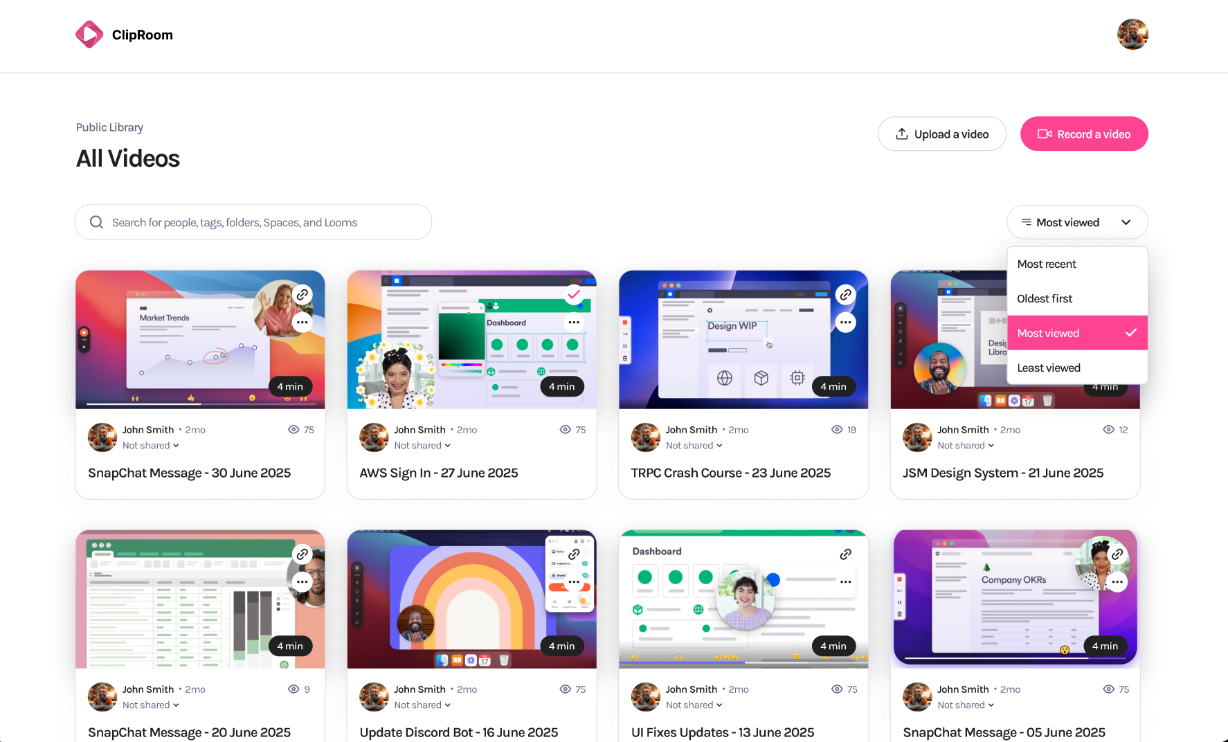 ClipRoom is a video recording and sharing platform for capturing, uploading, and managing screen recordings and video clips.